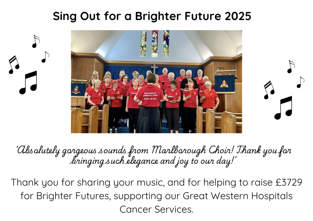 This event was set up in 2022, and is a celebration of local choirs from Swindon and surrounding areas. Each choir sings for 30 minutes in a supportive and encouraging environment where everyone can enjoy singing and listening to others whilst raising money for a good cause. Marlborough Community Choir is pleased to have taken part in 2022, 23, 24 and 25, and is looking forward to singing again next year (provisional date 20th June 2026). The event raised an amazing £1,597.00 for the Brighter Futures Appeal (Great Western Hospital Trust) in 2022, just over £2,000.00 in 2023, just over £3,100.00 in 2024, and just over £3,700 in 2025.